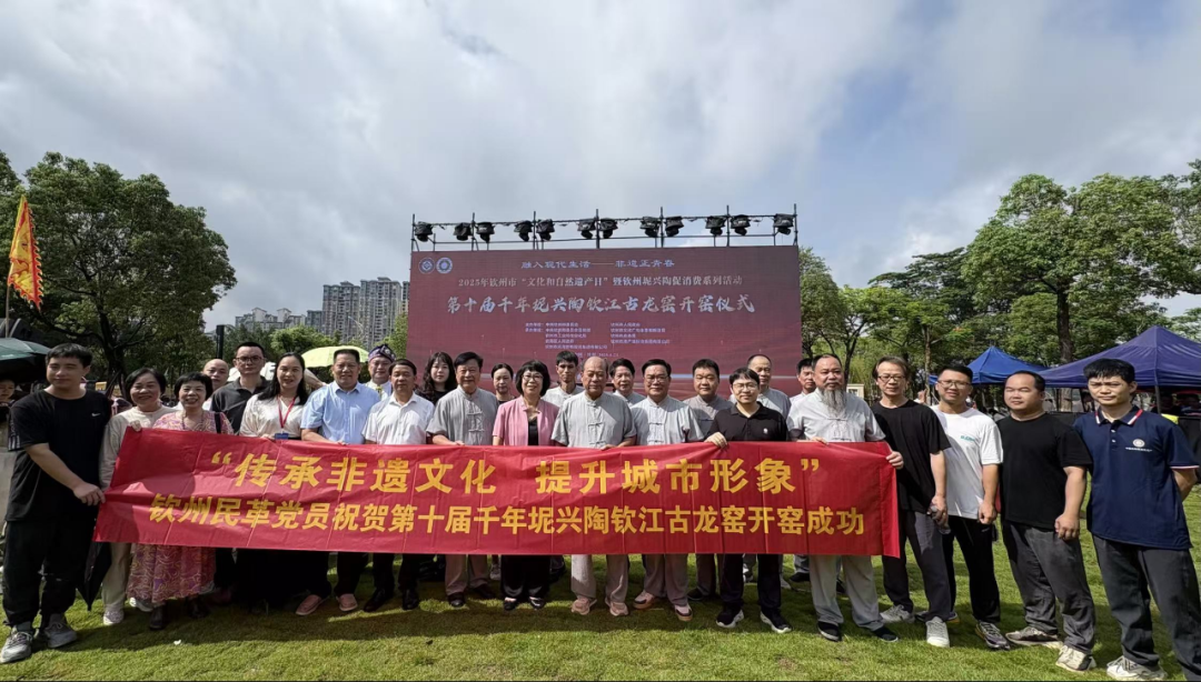 近日,第十届千年坭兴陶钦江古龙窑开窑仪式在钦州古龙窑举行。作为2025年钦州市“文化和自然遗产日”暨钦州坭兴陶促消费系列活动的“重头戏”,位于钦州城区平陆运河畔的古龙窑开窑活动现场人声鼎沸、热闹非凡。恰逢民革钦州市委坭兴陶文化支部成立五周年,钦州市政协副主席、民革钦州市主委林雪梅带领30多名民革党员、坭兴陶大师汇聚现场,以“传承非遗文化,提升城市形象”为主题祝贺千年坭兴陶钦江古龙窑开窑成功。